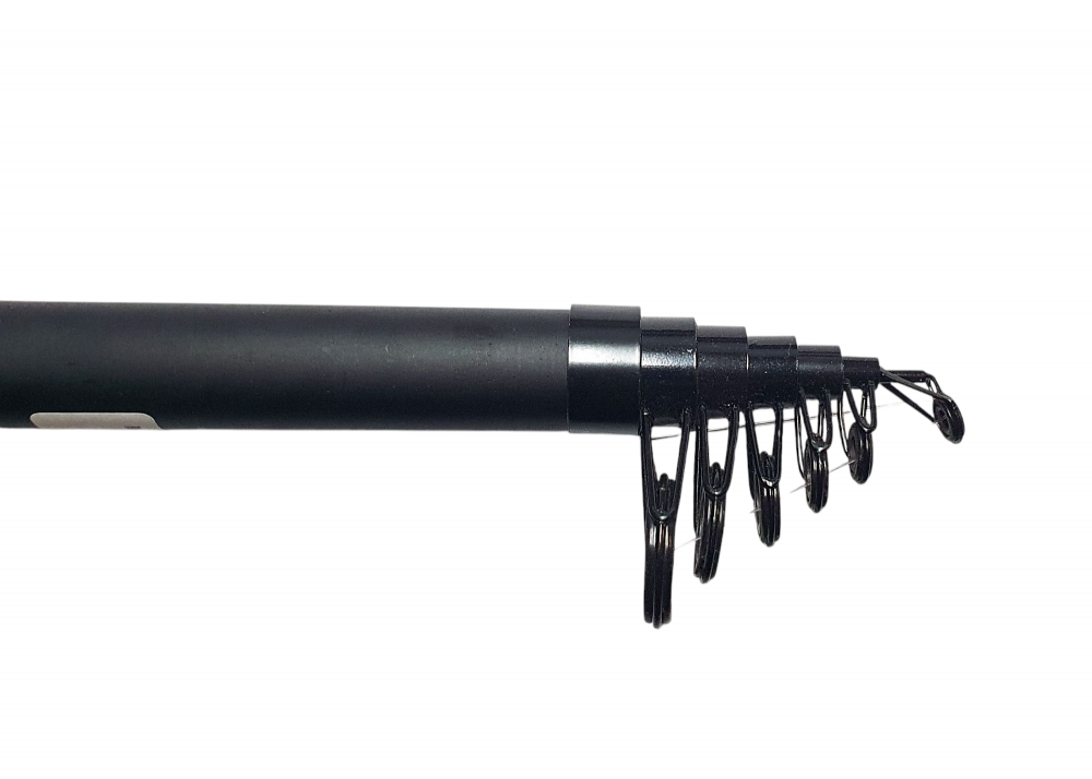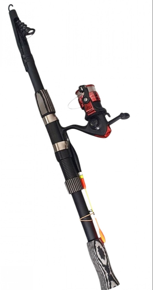 Ready-to-use, fully equipped telescopic rod with reel, monofilament line, float and sharp single-barreled hook.